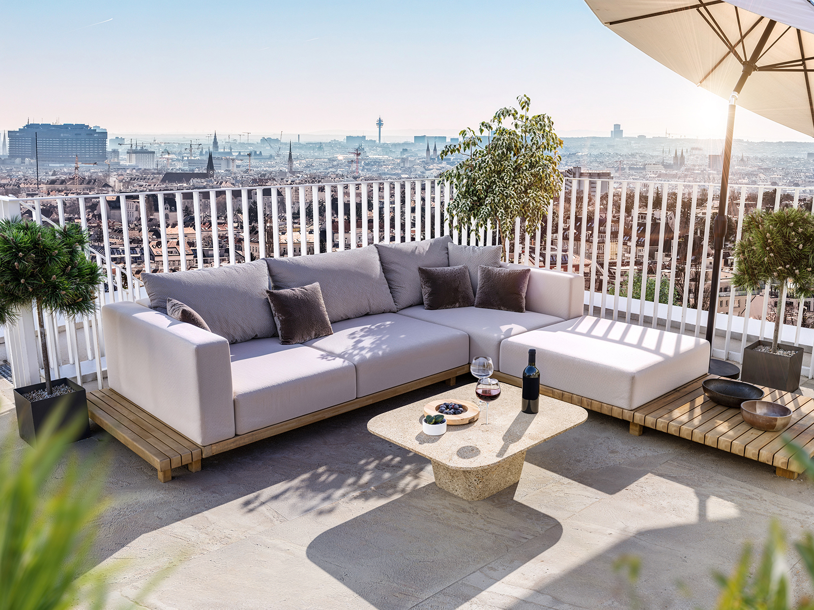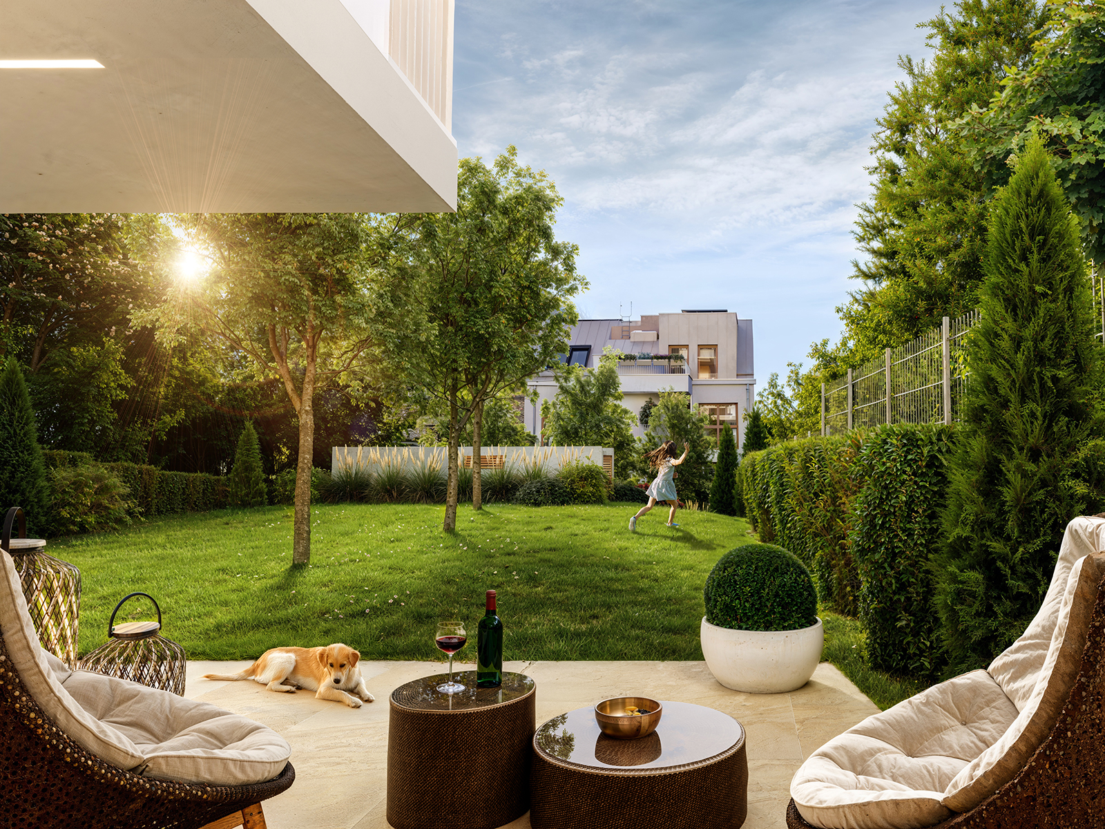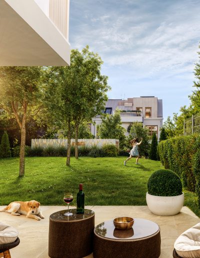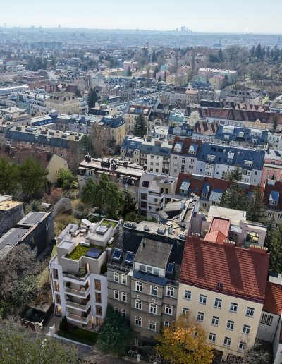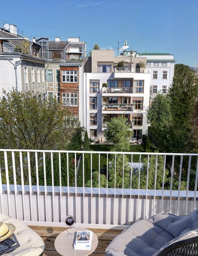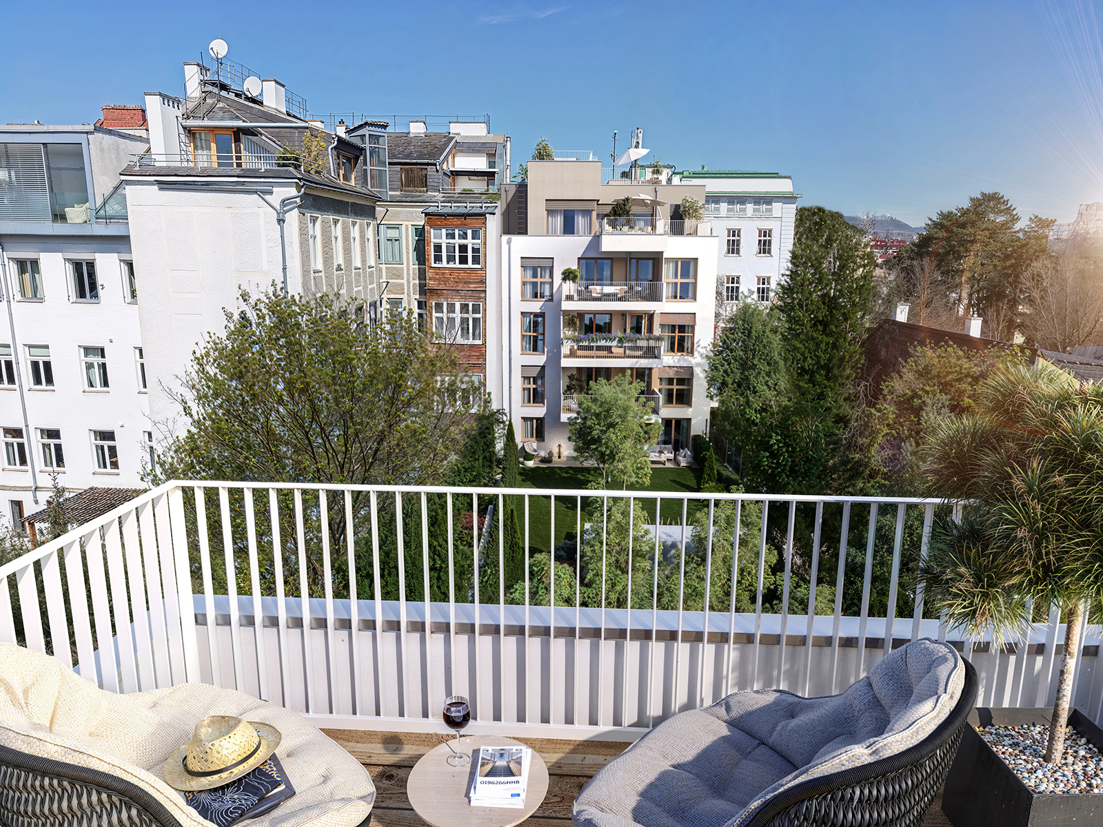 Die Wohnhäuser umrahmen einen privaten, harmonisch begrünten Innenhof, der den Gartenwohnungen zugeordnet ist und eine außergewöhnliche Oase der Ruhe zwischen Bastiengasse und Ferrogasse schafft.